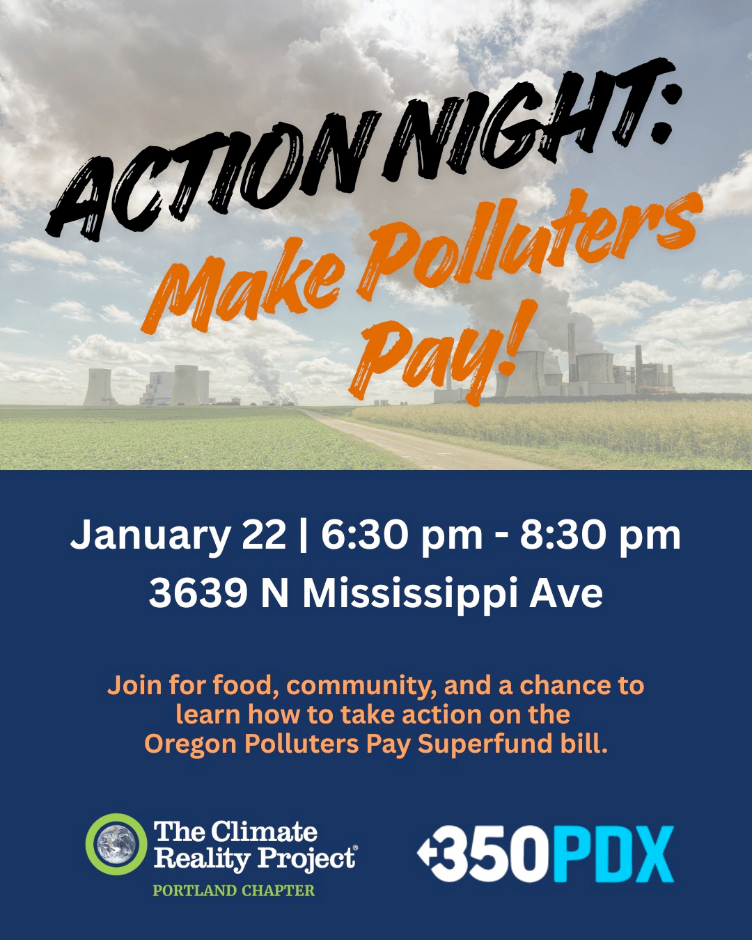 January Action Night will be a collaboration of the Oregon Make Polluters Pay (MPP) coalition: 350PDX, Breach Collective, Climate Reality Project Portland Chapter, Food & Water Watch, Mobilizing Climate Action Together, Oregon Environmental Council, Oregon Just Transition Alliance, Oregon League of Conservation Voters, Sacred Organizing Coalition, Sierra Club Oregon Chapter, Third Act Oregon. Join for food, community, and to take action!