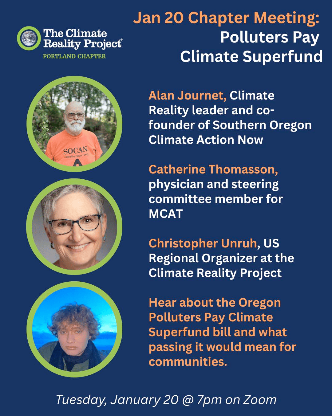 At our first Chapter meeting of 2026. We’ll hear from Alan Journet, Climate Reality leader and co-founder of Southern Oregon Climate Action Now, and Catherine Thomasson, physician and steering committee member for MCAT, about the Oregon Polluters Pay Climate Superfund bill and what passing it would mean for communities. We’ll also hear about the broader national Make Polluters Pay campaign from Christopher Unruh, Climate Reality Project Western Regional Organizer.